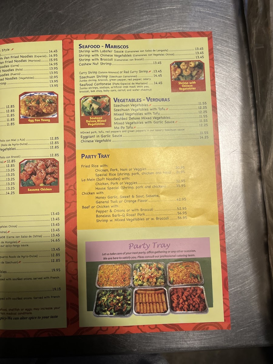 (Plato especial de mariscos) jumbo shrimps, scallops, artificial crab meat, straw mushroom, snow pea, broccoli, bok choy, baby corn, carrot, and water chestnut.
